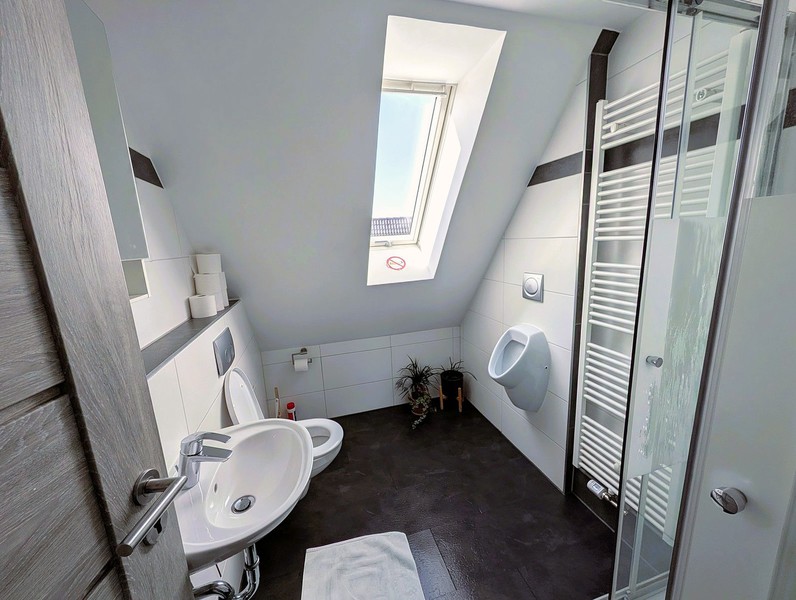 Für einen komfortablen Aufenthalt steht auf jeder unserer drei Etagen ein voll ausgestattetes, modernes Gemeinschaftsbad zur Verfügung. Ein besonderes Augenmerk legen wir auf die Hygiene: Alle Bäder werden wöchentlich gründlich gereinigt und desinfiziert, um höchsten Sauberkeitsstandards zu genügen und einen angenehmen Start in den Tag zu gewährleisten.